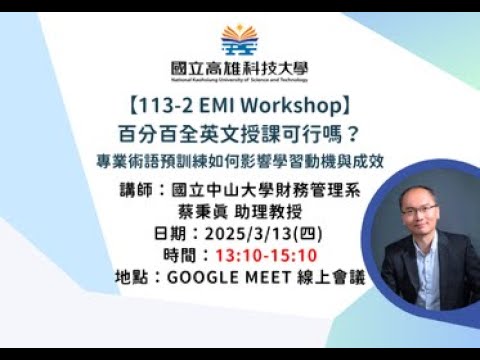 為了探索這個議題,本次工作坊特別邀請 國立中山大學財務管理系 蔡秉真 (Vincent) 助理教授,分享他如何透過專業術語預訓練,提升學生的學習動機與成效。Vincent老師擅長將學科理論與生活情境結合,以深入淺出的方式講授全英課程,本次老師將分享自身教學實踐研究經驗,誠摯邀請各位教師報名參加,共同探討 EMI 教學的挑戰與機會!